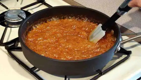 – ذوبي السكر على النار حتى يصبح كراميل ثم صبيه في صينية الكيك